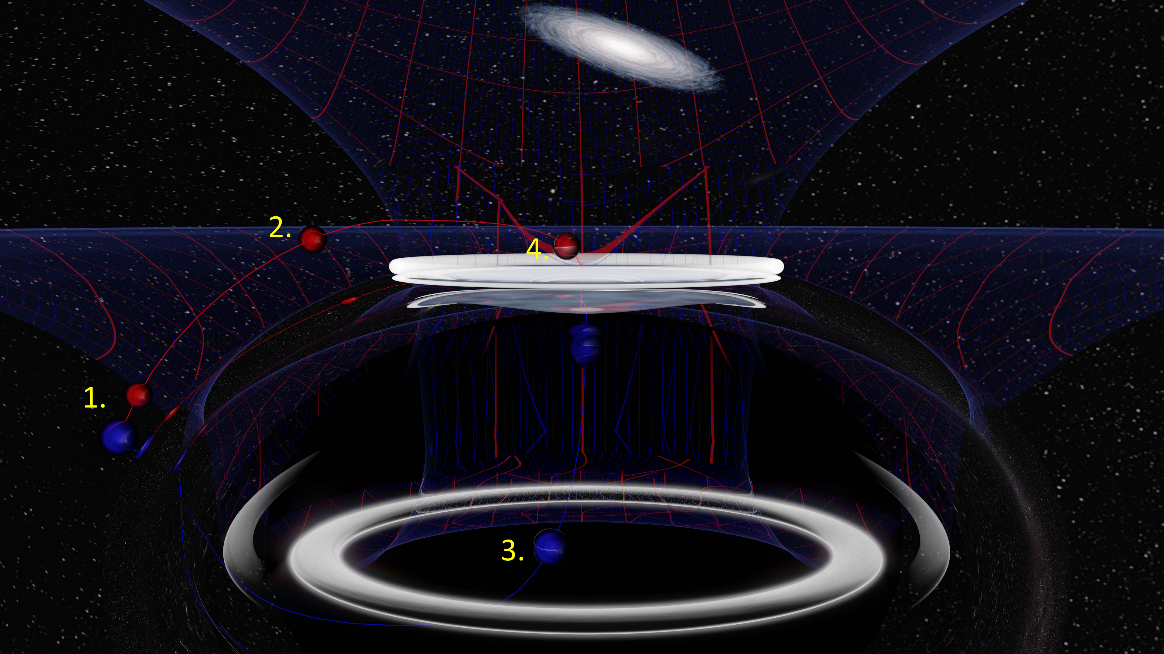 Looking at it in full we have the creation of a pair of entangled virtual particles at the event horizon of the black hole. One particle is escaping out into the universe while the other is falling down towards and through the ringularity. The particle trying to escape out into the universe will inevitably do many orbits around the outside edge of the event horizon before escaping out into the universe. The other particle travels down and through the ringularity and then back up through the white hole to exit spatially back outside in the parent universe, as part of the new child universe. Being entangled virtual particles they meet again at the event horizon of the white hole, which is itself apart of the black hole’s event horizon, cancelling each other out and giving back the energy borrowed from the mass of the black hole.