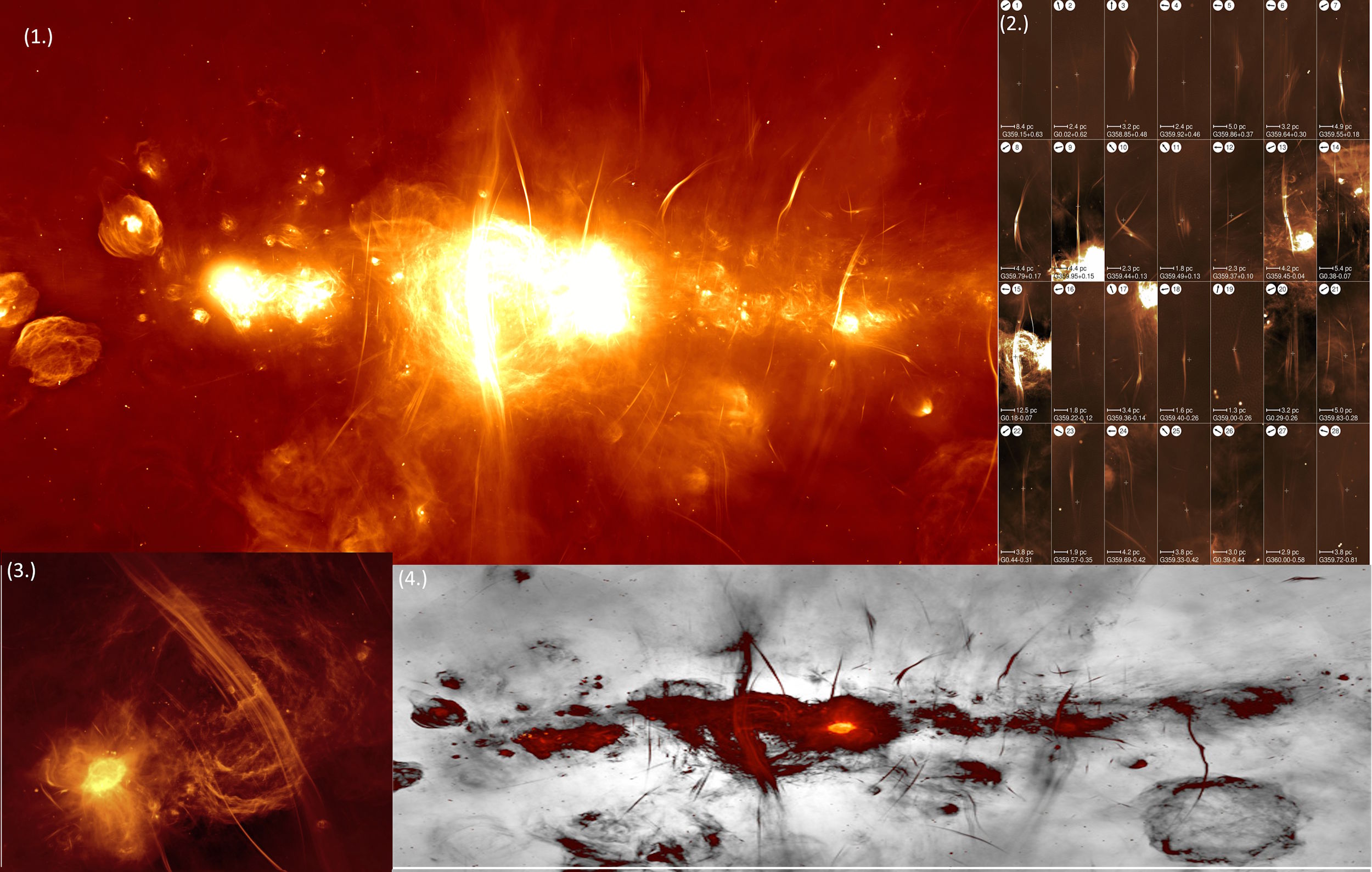1.) A MeerKAT image of the Galactic Center showing a number of filaments 2.) Nonthermal radio filaments from the 4"-resolution MeerKAT mosaic; oriented vertically for space; scales given assuming a distance of 8.2 kpc 3.) Radio image of a number of parallel filaments in the Galactic Center; Sagittarius A*, the Milky Way's central black hole, is located in the bright region in the bottom left 4.) MeerKAT’s radio view of the central regions of the Milky Way, highlighted by glowing red emissions surrounding the galaxy’s central black hole. [36]