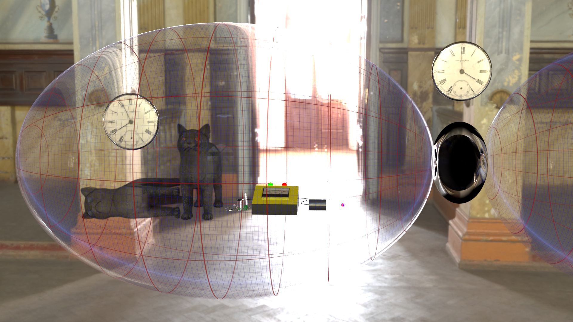 Us as an external observer of this entrapped manifold exist in upon the spacetime fabric of our universe with its own emergent arrow of time. We, unable to see or detect the cat, are unable to tell wither the cat is alive or dead. So rather we say the cat exists in a superposition state of being both alive and dead. Though, as a note, being a cat lover I naturally root for the cat being alive