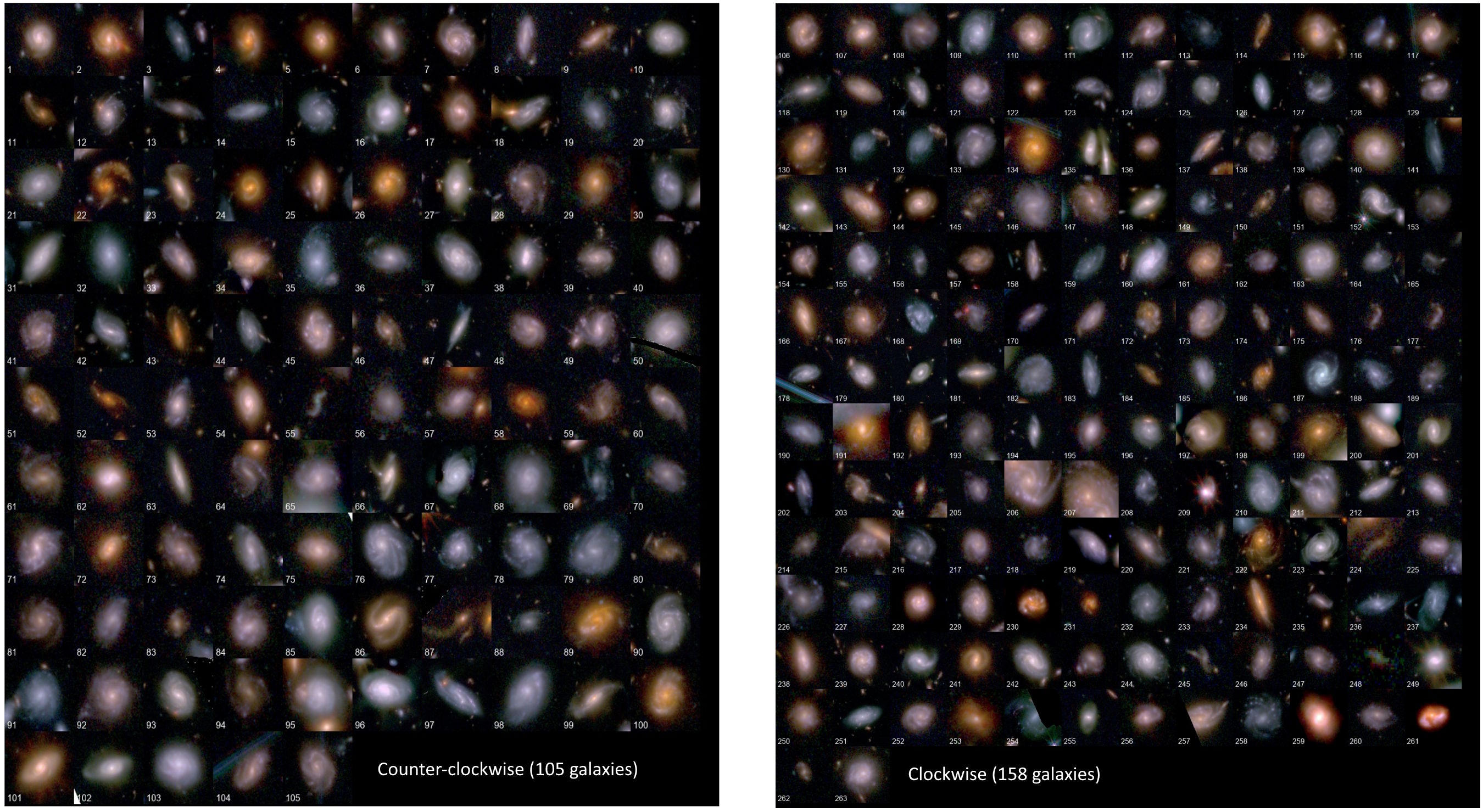 Galaxies from the early universe, JADES GOOD-S field, used in Lior Shamir's study showing a clear asymmetry between the number of galaxies with clockwise (105 galaxies) and counter-clockwise (158 galaxies) rotation. [29]