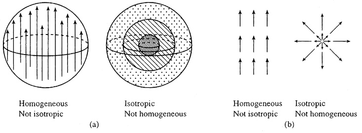 Illustrations of how homogeneity and isotropy are not equivalent in (a) three dimensions and (b) two dimensions. In the first example of each, a unique direction is picked out but translation invariance is maintained. In the second example of each, all directions are the same (rotation invariance) but a radial gradient exists. [2]